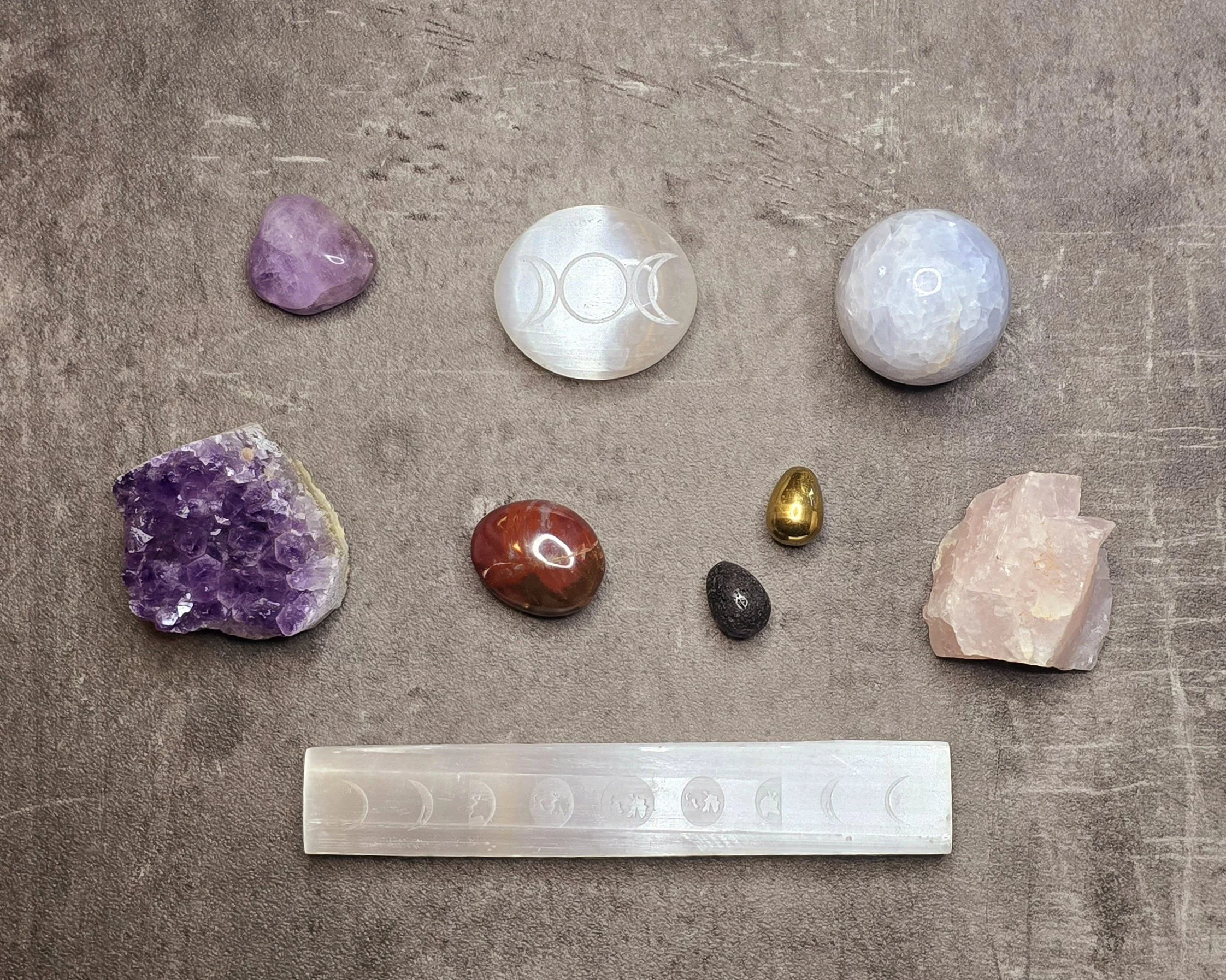 I chose specific crystals and shapes for this month’s altar, each selected with intention to support the energies of spring. This month’s stones include amethyst, satin spar, blue celestite, petrified wood, rose quartz, lava rock, and green onyx.
