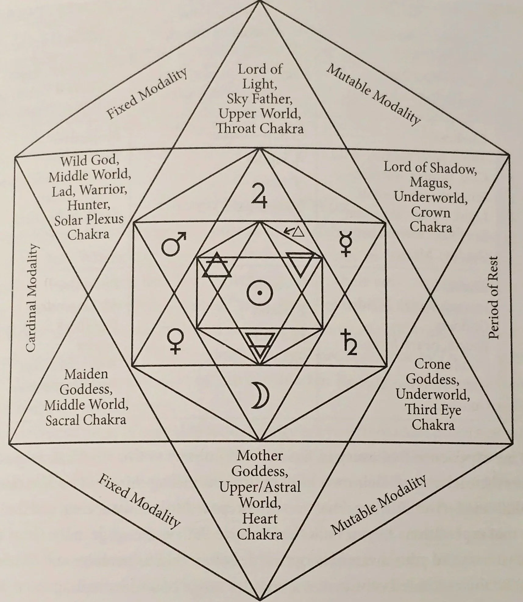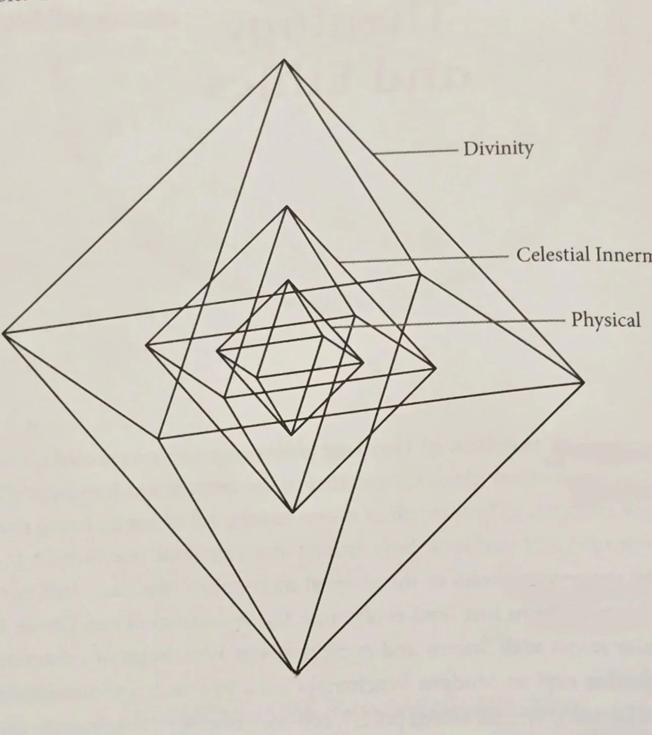The author presents a great model, featuring three nested octahedrons. They represent Divinity, Celestial Innermost, and the Physical realms. It’s a great introduction to sacred geometry and why so many similar images have been used throughout. I like to think of it as a focus tool for meditation and magickal workings. You’re able to have “somewhat” a visual “map” type of thing. This way, you’re able to be more precise on which energy you’re trying to work with.